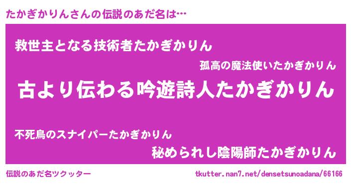 ヘコむあだ名 | 『たかぎかりん(小並感)』『レバニラ』 |