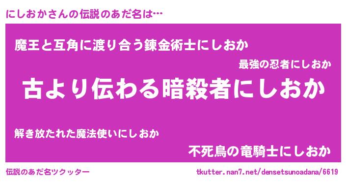 | 女子向けラノベタイトル風あだ名 | 『にしおかの契約王妃』『にしおか恋絵巻』 |