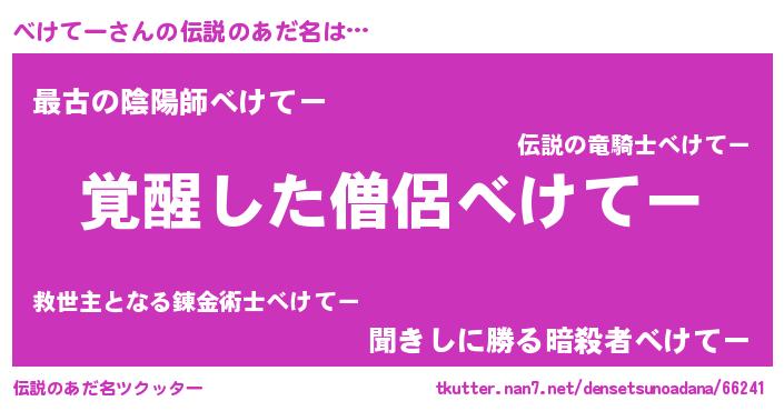 | 男性向けラノベタイトル風あだ名 | 『べけてー~年齢イコール彼女いない歴の魔法使い~』 |