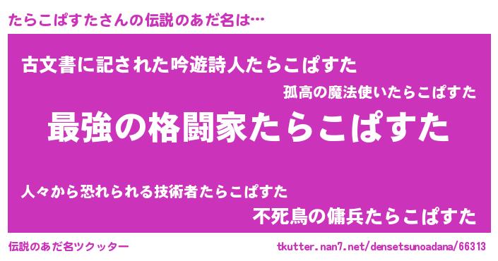 | 男性向けラノベタイトル風あだ名 | 『この素晴らしい世界にたらこぱすたを!』 |