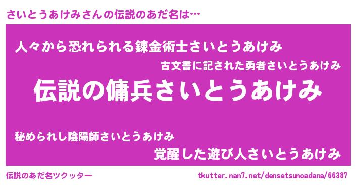 | ヒーロー風カッコイイあだ名 | 『スーパーサイトウアケミ』 |
