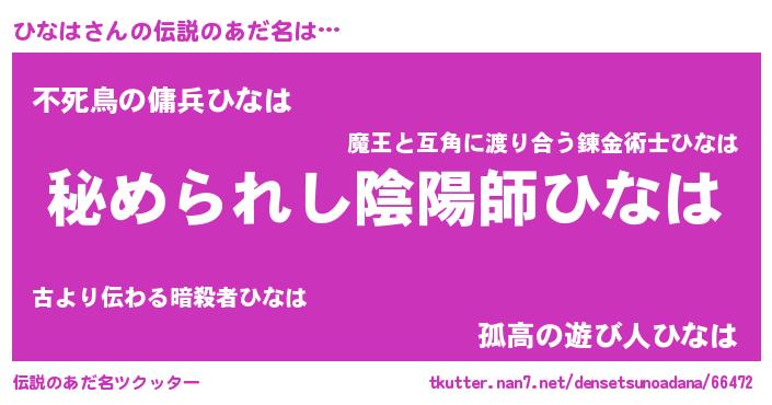 | 男性向けラノベタイトル風あだ名 | 『魔弾の王とひなは』『ひなはの憂鬱』 |