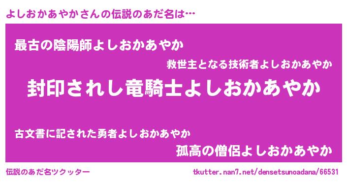 | 男性向けラノベタイトル風あだ名 | 『ヨシオカアヤカアートオンライン』 |
