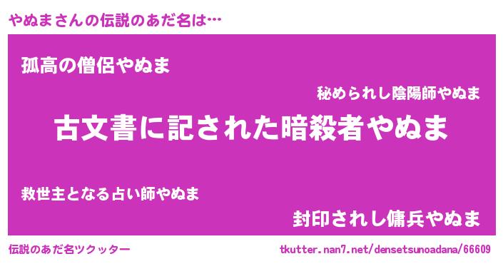 | 意味不明あだ名 | 『住所不定無職やぬま(53歳)』『自称やぬま』 |