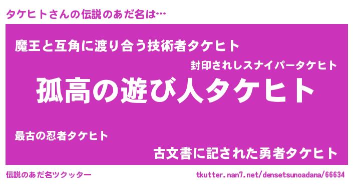 男性向けラノベタイトル風あだ名 | 『魔弾の王とタケヒト』 |