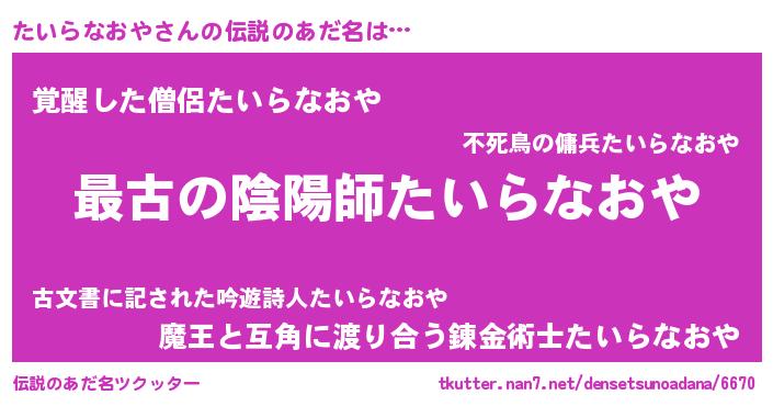 | 意味不明あだ名 | 『たいらなおやフォーエバー』 |