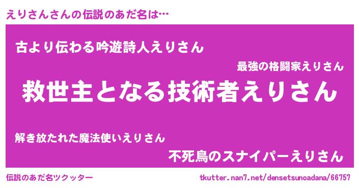 | 男性向けラノベタイトル風あだ名 | 『Re:えりさんから始める異世界生活』 |