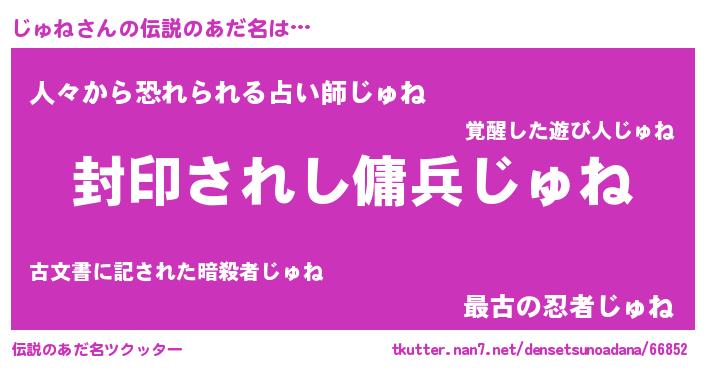 | 男性向けラノベタイトル風あだ名 | 『じゅねに滅ぼされるだけの簡単なお仕事です』 |