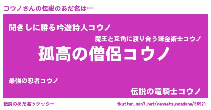 | ヒーロー風カッコイイあだ名 | 『仮面コウダー』『魔戒騎士コウ』 |