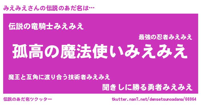 | ヒーロー風カッコイイあだ名 | 『黄金騎士ミエ』『最強戦士ミエミエ』 |
