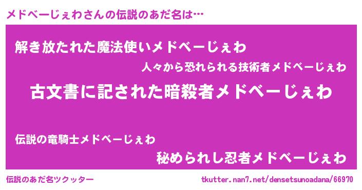 | ヒーロー風カッコイイあだ名 | 『ネオメドベージェワ』『魔戒騎士メド』 |