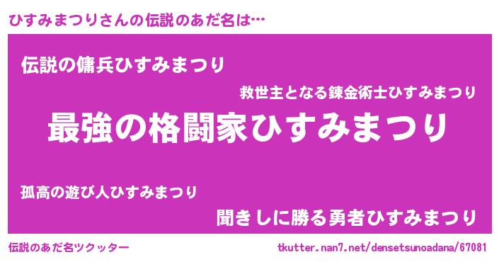 | 男性向けラノベタイトル風あだ名 | 『うちの娘の為ならば、俺はもしかしたらひすみまつりも倒せるかもしれない。』 |