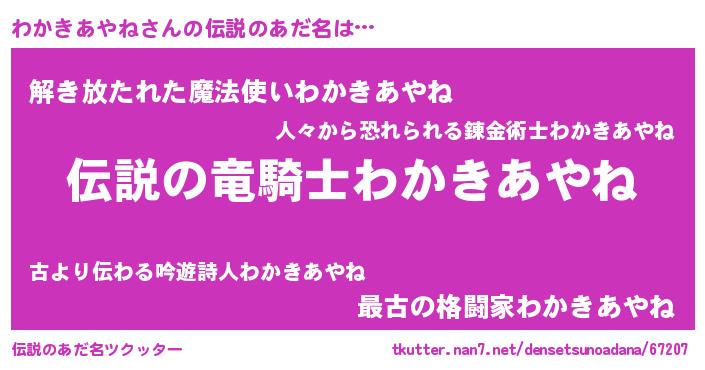 | 男性向けラノベタイトル風あだ名 | 『緋弾のワカキアヤネ』 |
