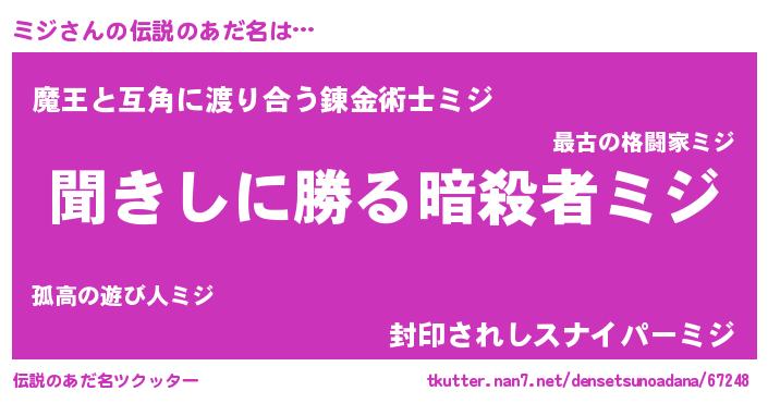 | 男性向けラノベタイトル風あだ名 | 『魔弾の王とミジ』『魔法科高校のミジ』 |