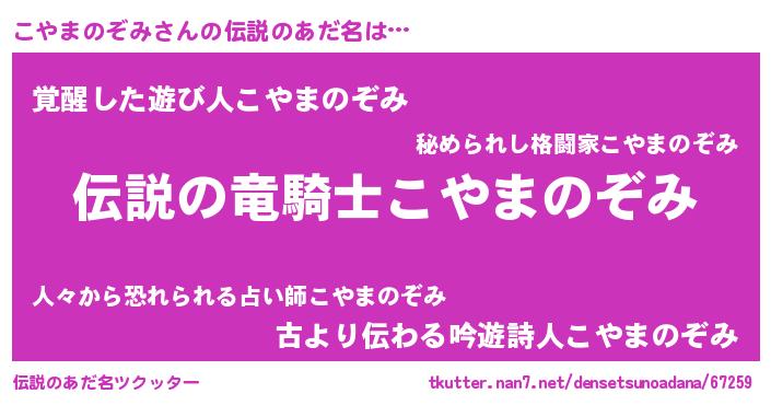 | ヒーロー風カッコイイあだ名 | 『スーパーコヤマノゾミ』『魔戒騎士コヤ』 |