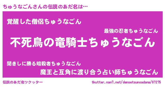 | 男性向けラノベタイトル風あだ名 | 『転生したらちゅうなごんだった件』 |