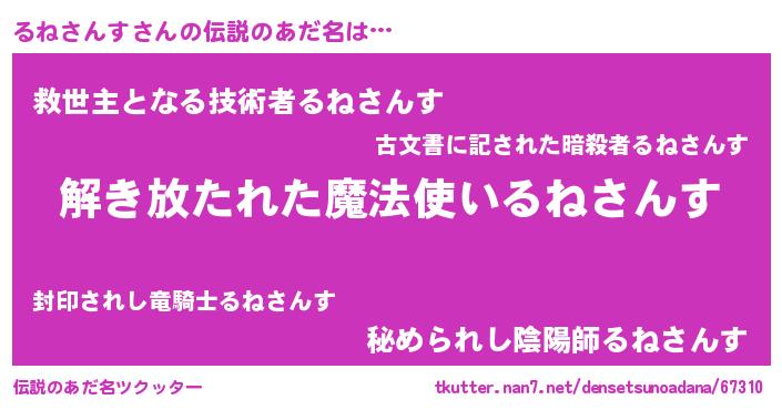| 男性向けラノベタイトル風あだ名 | 『るねさんすの嫁は女の子じゃないと思った?』 |