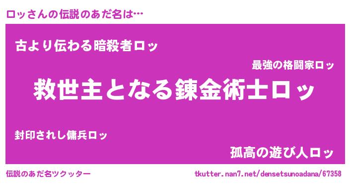 | ヒーロー風カッコイイあだ名 | 『慈愛の使者ロッ』『ネオロッ』 |
