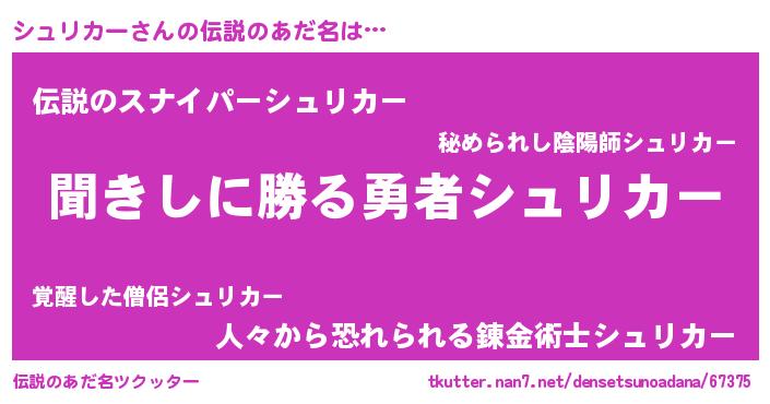 | 男性向けラノベタイトル風あだ名 | 『魔弾の王とシュリカー』 |