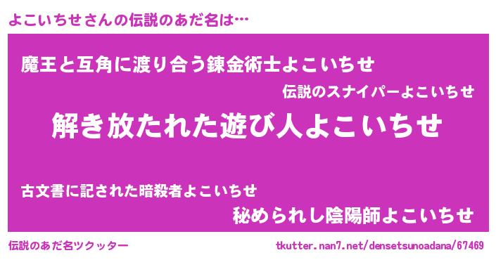 | 女子向けラノベタイトル風あだ名 | 『よこいちせの卵を拾いまして』 |