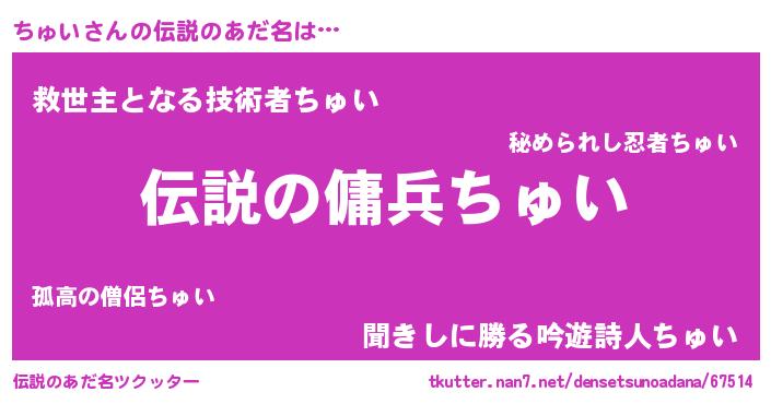 | 男性向けラノベタイトル風あだ名 | 『ちゅいの憂鬱』『はたらくちゅいさま!』 |