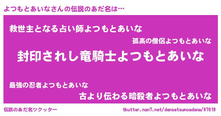 | 男性向けラノベタイトル風あだ名 | 『よつもとあいなに滅ぼされるだけの簡単なお仕事です』 |