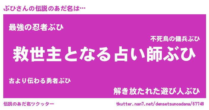 | 男性向けラノベタイトル風あだ名 | 『ぶひに滅ぼされるだけの簡単なお仕事です』 |