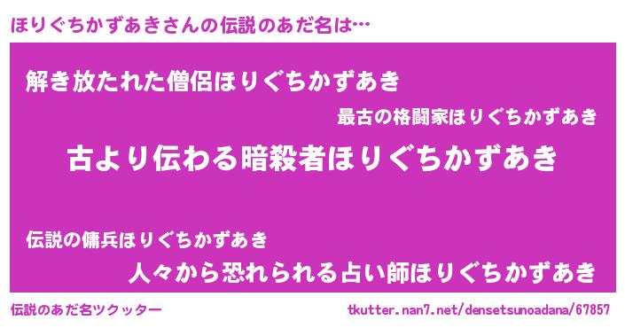 | 男性向けラノベタイトル風あだ名 | 『ほりぐちかずあきに滅ぼされるだけの簡単なお仕事です』 |