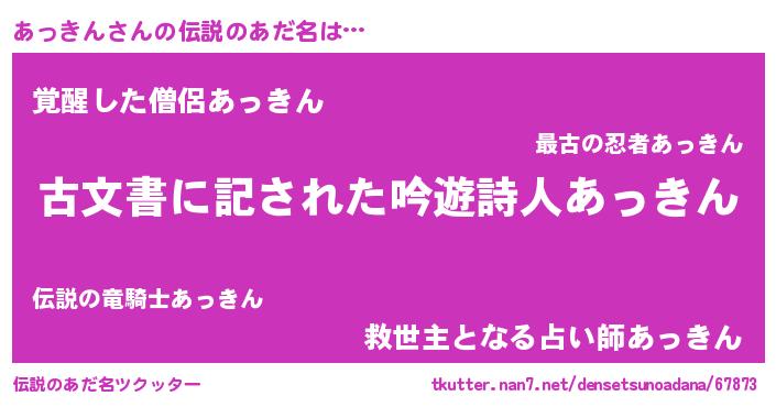 | 男性向けラノベタイトル風あだ名 | 『Re:あっきんから始める異世界生活』 |
