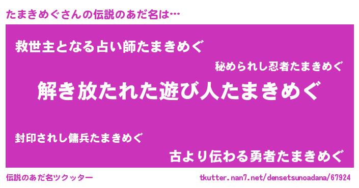 | 男性向けラノベタイトル風あだ名 | 『たまきめぐの嫁は女の子じゃないと思った?』 |