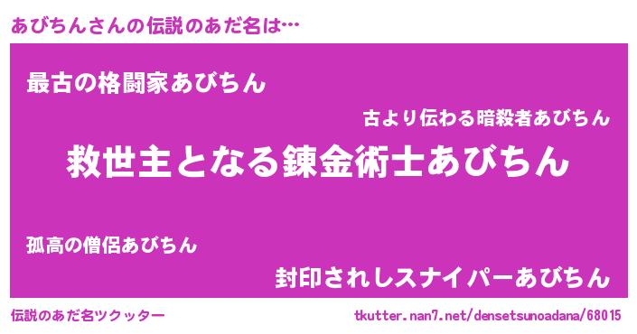 | 女子向けラノベタイトル風あだ名 | 『死神あびちんの再婚』 |