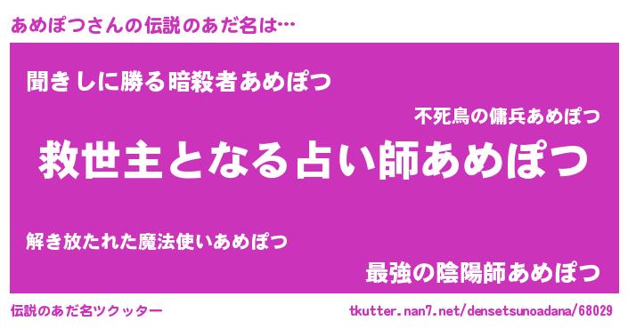 | 欧米人風あだ名 | 『アンジェラ・あめぽつ』 |