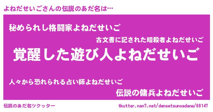 | 男性向けラノベタイトル風あだ名 | 『うちのよねだせいごが世界を掌握している!』 |
