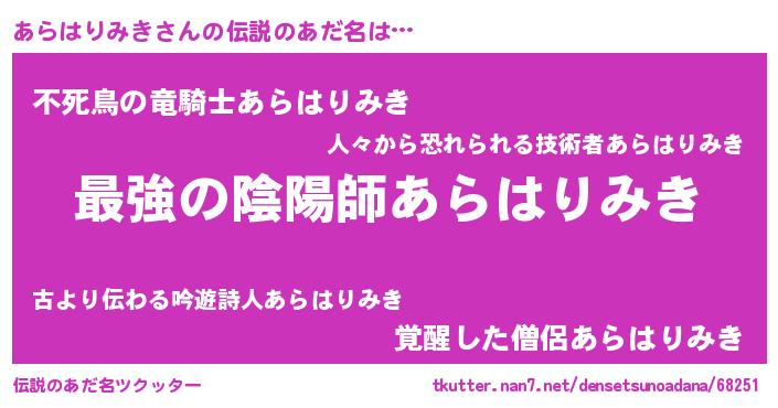 | 男性向けラノベタイトル風あだ名 | 『あらはりみき~年齢イコール彼女いない歴の魔法使い~』 |