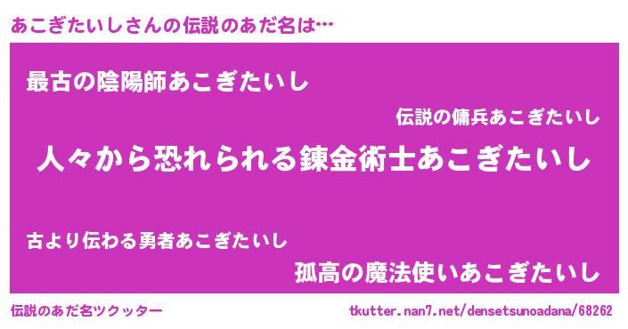 | 男性向けラノベタイトル風あだ名 | 『おまえをオタクにしてやるから、俺をあこぎたいしにしてくれ! 』 |