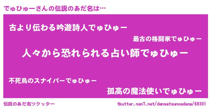 | ヒーロー風カッコイイあだ名 | 『正義の使者でゅひゅー』『仮面デュダー』 |