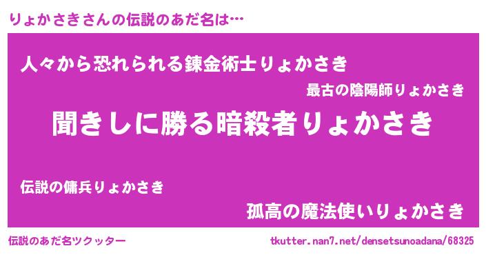 | 意味不明あだ名 | 『自称りょかさき』『永久保存りょかさき』 |
