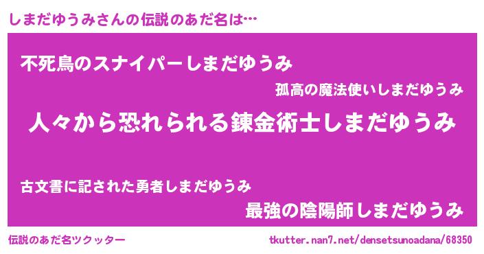 | 男性向けラノベタイトル風あだ名 | 『おまえをオタクにしてやるから、俺をしまだゆうみにしてくれ! 』 |