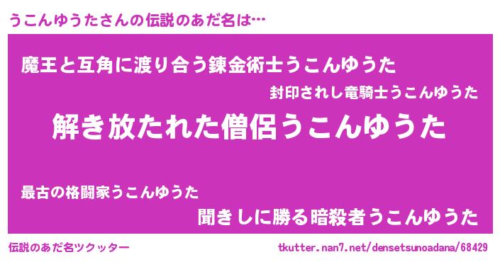 | 男性向けラノベタイトル風あだ名 | 『うこんゆうたの嫁は女の子じゃないと思った?』 |