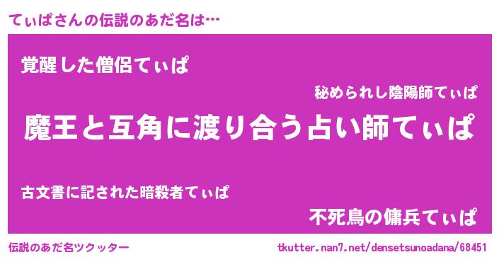 | 男性向けラノベタイトル風あだ名 | 『魔法科高校のてぃぱ』 |