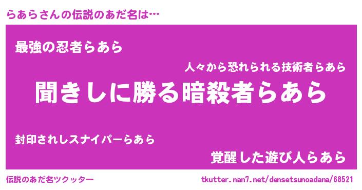| 男性向けラノベタイトル風あだ名 | 『らあらという概念が存在しない退屈な世界 』 |