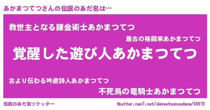 | 男性向けラノベタイトル風あだ名 | 『あかまつてつの嫁は女の子じゃないと思った?』 |