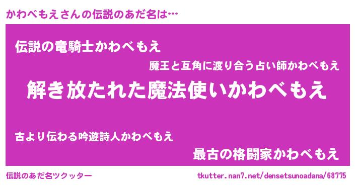 | 男性向けラノベタイトル風あだ名 | 『転生したらかわべもえだった件』 |