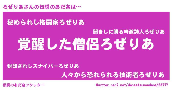 | 男性向けラノベタイトル風あだ名 | 『ろぜりあに滅ぼされるだけの簡単なお仕事です』 |