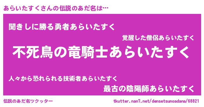 | 女子向けラノベタイトル風あだ名 | 『あらいたすく姫と円卓の騎士』 |