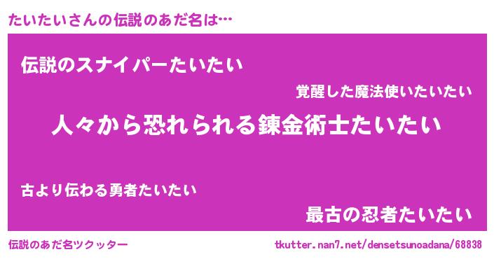 | 男性向けラノベタイトル風あだ名 | 『魔弾の王とたいたい』『たいたいの憂鬱』 |