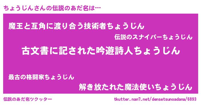 | 男性向けラノベタイトル風あだ名 | 『ちょうじんに滅ぼされるだけの簡単なお仕事です』 |