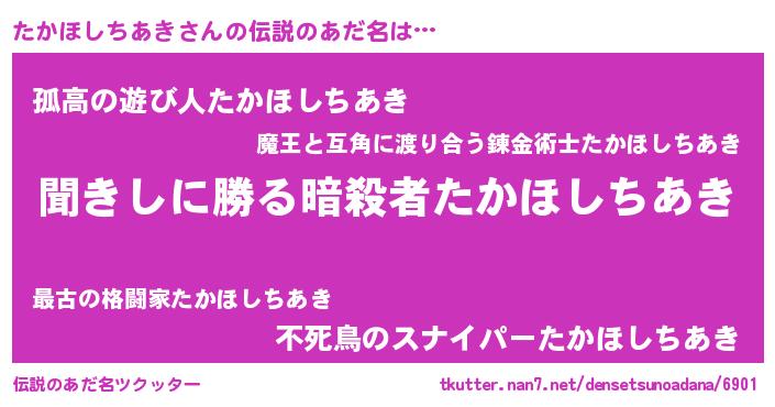 | 男性向けラノベタイトル風あだ名 | 『魔弾の王とたかほしちあき』 |