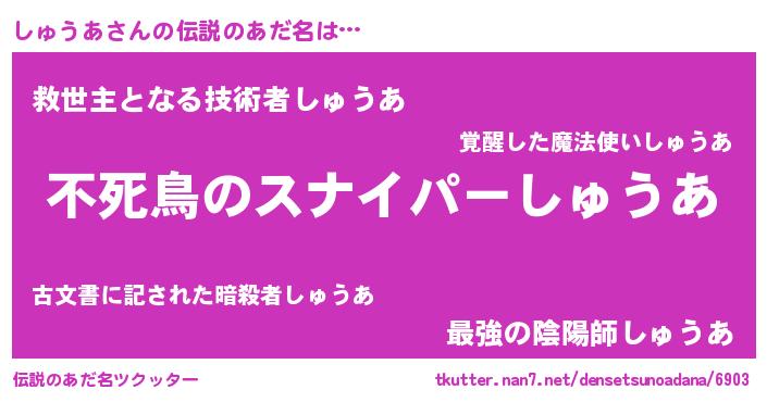 | 男性向けラノベタイトル風あだ名 | 『しゅうあの憂鬱』『シュウアスレイヤー』 |