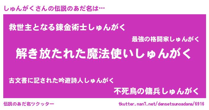 | ヒーロー風カッコイイあだ名 | 『銀牙騎士シュ』『慈愛の使者しゅんがく』 |